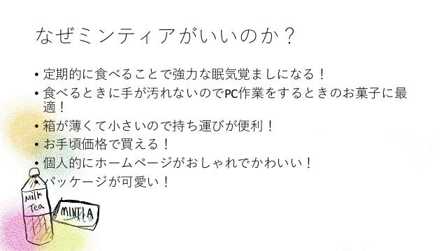 05/06/16 · ミンティアは眠気をとるのに効果はありますか? 最近授業中どうしても眠くなります。 今年は大事な年になるので、できれば起きてしっかり授業を受けたいです。 別に寝不足とかで眠いわけではありません。 朝から眠いときもあります。 眠くならないように色々試してみた(ちょっとした運動とか)のですが効果がないです。 そこでクラスメイトを観察しているMINTIA BITTER MINT(ミンティア ビターミント) 眠気防止度:3/5点 ミント感:4/5点 強め 刺激:4/5点 辛口眠くてもミンティアを食べすぎてはいけない 入試本番が近くなったら、普段通り過ごすことが一番です。 私の失敗談。 受験日に眠気覚ましにと思って普段は食べないミンティアを休み時間ごとに6粒食べました。 翌日に人生最高レベルの腹痛。 2時間動けませんでした。 ミンティアの食べすぎで腹痛が起こることがあるらしいです。 入試前は意識して普段通りを